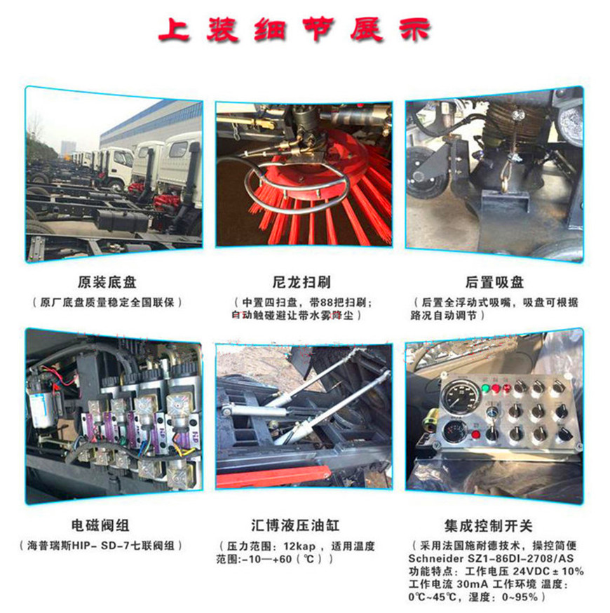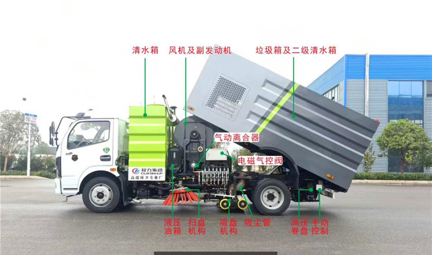 東風(fēng)8方洗掃車采用東風(fēng)型國五二類底盤改裝,加裝副發(fā)動(dòng)機(jī)、風(fēng)機(jī)、高壓水泵、清水箱、垃圾箱、左右立掃、帶噴水桿的寬吸嘴、低壓沖洗系統(tǒng)、垃圾箱自潔,掃盤降塵系統(tǒng),液壓系統(tǒng)、專用裝置電控系統(tǒng)和副車架等改裝而成: