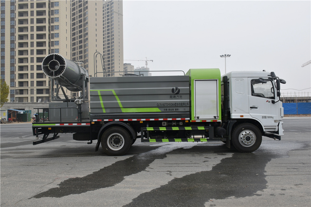 多功能抑塵車 產品主要技術資料 產品名稱: 多功能抑塵車 外型尺寸(mm): 8850,8650,8810×2500,2550×3800,3900 底盤型號: EQ1180GL6DJ 貨廂尺寸(mm): 3400×2450×1580 總 質 量 :(kg) 18000 接近/離去角(° ) 25/13,28/13 額定質量:(kg) 7550,7485,8150,8085,9050,8985 前懸/后懸(mm): 1450/2900,1250/2900,1410/2900 整備質量:(kg) 10320,9720,8820(Kg) 高車速(km/h): 88 排放標準: 國六 底盤參數 底盤型號: EQ1180GL6DJ 軸荷: 6500/11500 軸 數: 2 燃油種類: 柴油 軸 距(mm): 4500 前 輪 距(mm): 1875,1910,1950,1965,1970,2020,2050 駕駛室乘人數: 2,3 后 輪 距(mm): 1820,1870 輪 胎 數: 6 彈簧片數: 9/11+8,3/4+3,9/10+8 輪胎規格: 10.00R20 18PR,295/80R22.5 16PR,275/80R22.5 18PR 整車說明: 該車用途為抑塵降霾.主要裝置為罐體及噴霧裝置;隨底盤選裝駕駛室;罐體有效容積:10.5立方米,罐體外形尺寸(長×長軸×短軸)(mm):3400×2450×1580,ABS型號及生產廠家為:3631010-C2000/東科克諾爾商用車制動系統(十堰)有限公司,J ABS/焦作博瑞克控制技術有限公司;側、后防護材料均為:Q235碳鋼,連接方式均為:螺栓連接,后部防護截面尺寸(mm):120×50,后部防護離地高度(mm):450.選裝罐體左右樣式,選裝噴霧裝置樣式。 發動機參數 發動機型號 發動機生產企業 排量(ml) 功率(kw) YCS06200-60 廣西玉柴機器股份有限公司 6234 147/199 灑水車底盤配置:東風汽車集團有限公司國六系列底盤。整車配備:廣西玉柴機器股份有限公司四缸玉柴200馬力發動機,發動機型號YCS04200- 68, 法士特8檔變速箱,10.00R20輪胎。