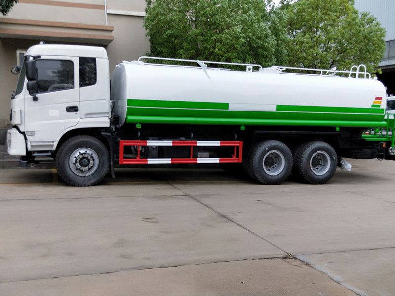 20噸灑水車,吸程≧7米,灑水寬度≧14-16米,射程≧25-30米,引水時間<5min,流量60m3/h。前沖(噴)、后灑、帶側噴(花灑)、帶后工作平臺、平臺上安裝綠化灑水高炮(炮噴射形狀可調節:直沖、大雨、中雨、毛毛雨、霧狀、可連續調節,360°旋轉),配消防接口,自流閥,濾網,帶自吸自排功能。配備大功率專用灑水泵,泵可自吸自排,安裝過濾網,帶消防接口,可通過消防栓進水,帶自流閥,隨車選裝20米綠化卷盤,可噴灑農藥,罐體金屬漆。罐體有橢圓和方圓罐兩種,可根據用戶的要求定做。
