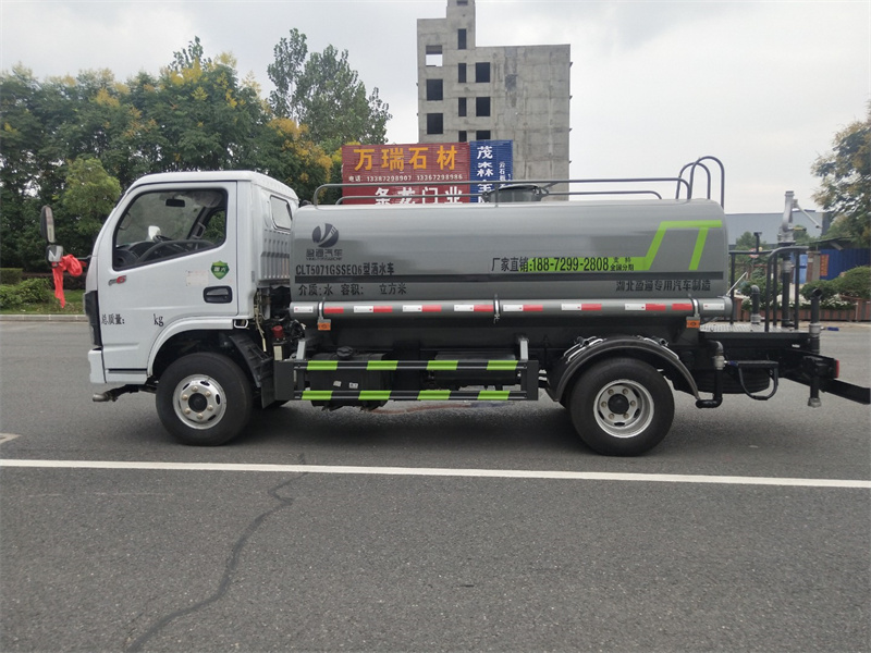 .東風5噸灑水車產品主要技術參數 序號 名稱 型號、規格 1 整車型號 CLT5071GSSEQ6 型灑水車 2 發動機型號 D20TCIF1 3 發動機馬力/功率 云內 126 馬力/93KW 4 發動機排量 1999ML 5 變速箱 萬里揚 5 檔 6 輪胎規格 7.00 鋼絲胎 7 軸距 3308 8 總質量 7360KG 9 整備質量 3220KG 10 額定載質量 4010KG 11 整車尺寸(長×寬×高) 6.15*1.99*2.4 12 罐體容積 5 方 13 燃料種類 柴油 14 排放標準 國六 15 水泵型號 40/50 16 罐體材質 Q235 碳鋼