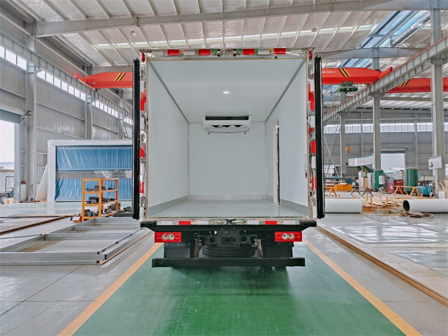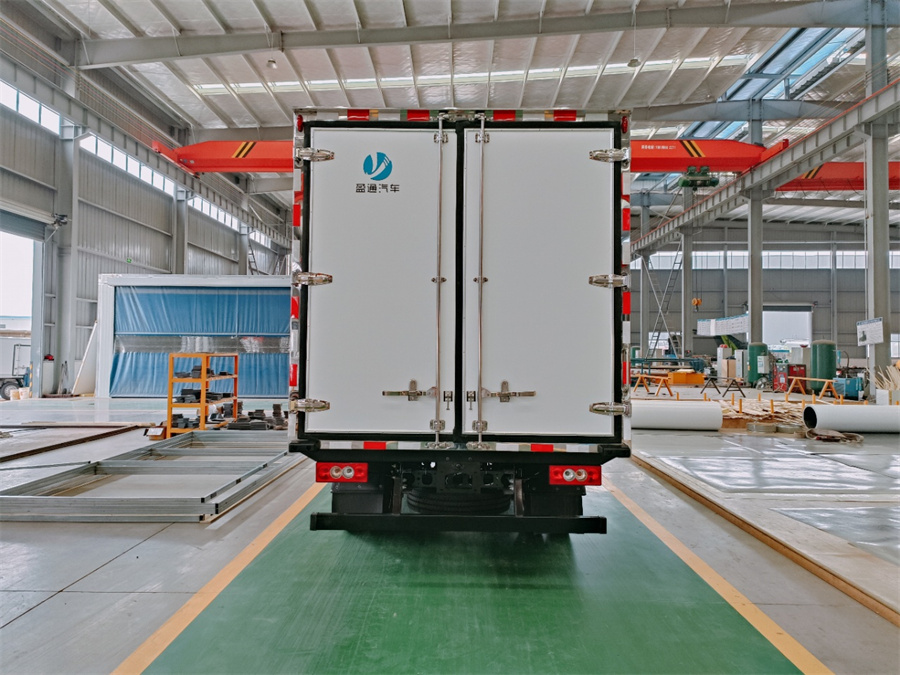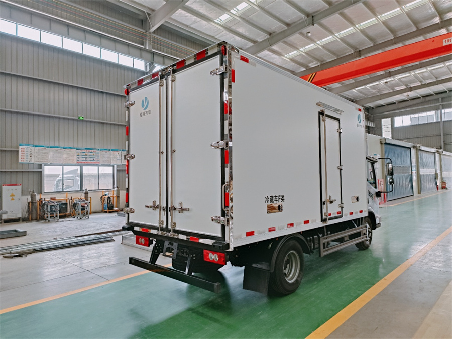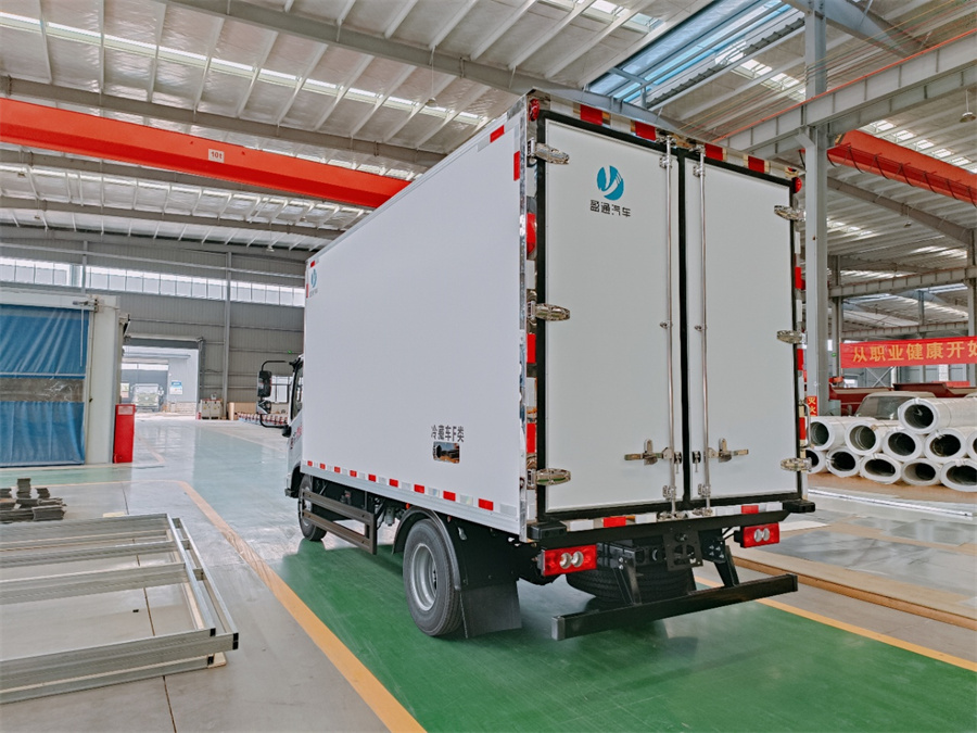 廂體采用內外玻璃鋼材料制作,中間夾層為高密度保溫材料,用真空復合一次成型,表面光潔平整,強度高,使用壽命長,廂體邊緣采用優質鋁合金包邊和專用密封膠處理,具有重量輕、保溫、密封效果好等特點。門框鎖件為不銹鋼材質,門四周用一次成型密封條密封,廂體外形平整美觀,車廂頂部加以雨檐,避免下雨天雨水對車廂的浸泡,延長廂體使用壽命,車廂內配有人性化照明系統。穩固性和氣密性是普通冷藏車廂體不可比的,并且具有質量輕,抗沖擊力強,無滲透等優點。配備國產580制冷機組。