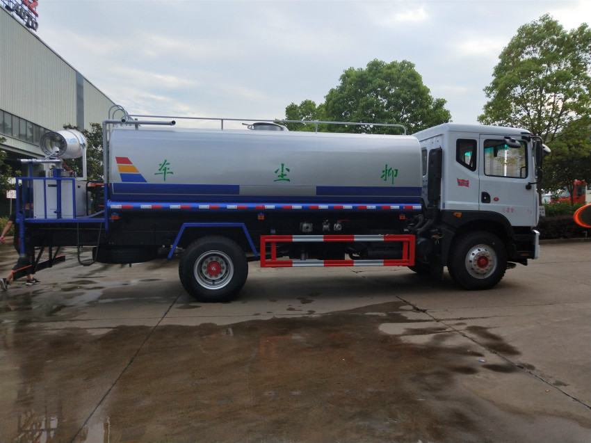 灑水車上裝配置:整車具有前沖、后灑、側(cè)噴(更換噴頭后變?yōu)閭?cè)花灑)、后置式工作平臺(帶踏梯,四周有安全護(hù)欄)、平臺上設(shè)置有高壓水炮(可360°全方位旋轉(zhuǎn),水流可調(diào)成柱狀,射程28米;也可調(diào)成霧狀,射程14米,可連續(xù)噴射出:直沖狀、大雨、中雨、小雨、毛毛雨)。該車灑水寬度大于14米,配備優(yōu)質(zhì)大功率專用灑水泵、取力器、雜物過濾網(wǎng)、國標(biāo)通用65型消防接口(可通過消防栓加水)、1套自流球閥系統(tǒng)(可自吸自排,吸程6米)、2根引水鋼絲膠管(帶陰陽快速接頭)、配鎖、水位計、高音作業(yè)喇叭,兩側(cè)及后加強(qiáng)型保險杠,防滑爬梯,膠管儲存筒。