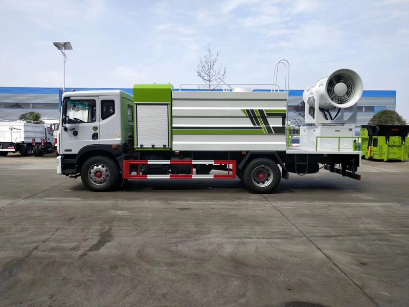 霧炮車罐體采用5mm厚碳鋼板制作,罐體容積12噸,配備大功率專用灑水泵。前沖(噴)后灑,帶側噴,后置工作平臺,平臺上安裝綠化灑水高壓炮(炮噴射形狀可調成直沖狀、大雨、中雨、毛毛雨、炮可360度旋轉,射程≧25米)。帶自流閥,消防接口。帶自吸泵,可抽水或從消防栓上連接注水。后工作平臺可加裝最小50米霧炮或60米、80米霧炮。