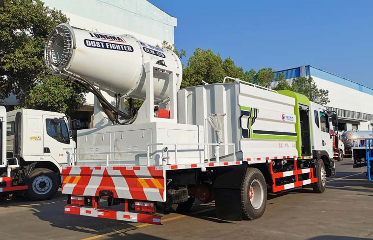 東風霧炮車上裝配置:罐體容積10立方,罐體為方形罐,罐體內(nèi)部做防腐,罐體鋼板采用Q235碳鋼鋼材,整車具備灑水車的一切功能(前沖、后灑、側(cè)噴、平臺高炮),氣動球閥控制灑水功能,水位報警器,標配億豐60/90水泵,自流閥及消防接頭各1個、水管2根。后平臺安裝一臺80米霧炮。