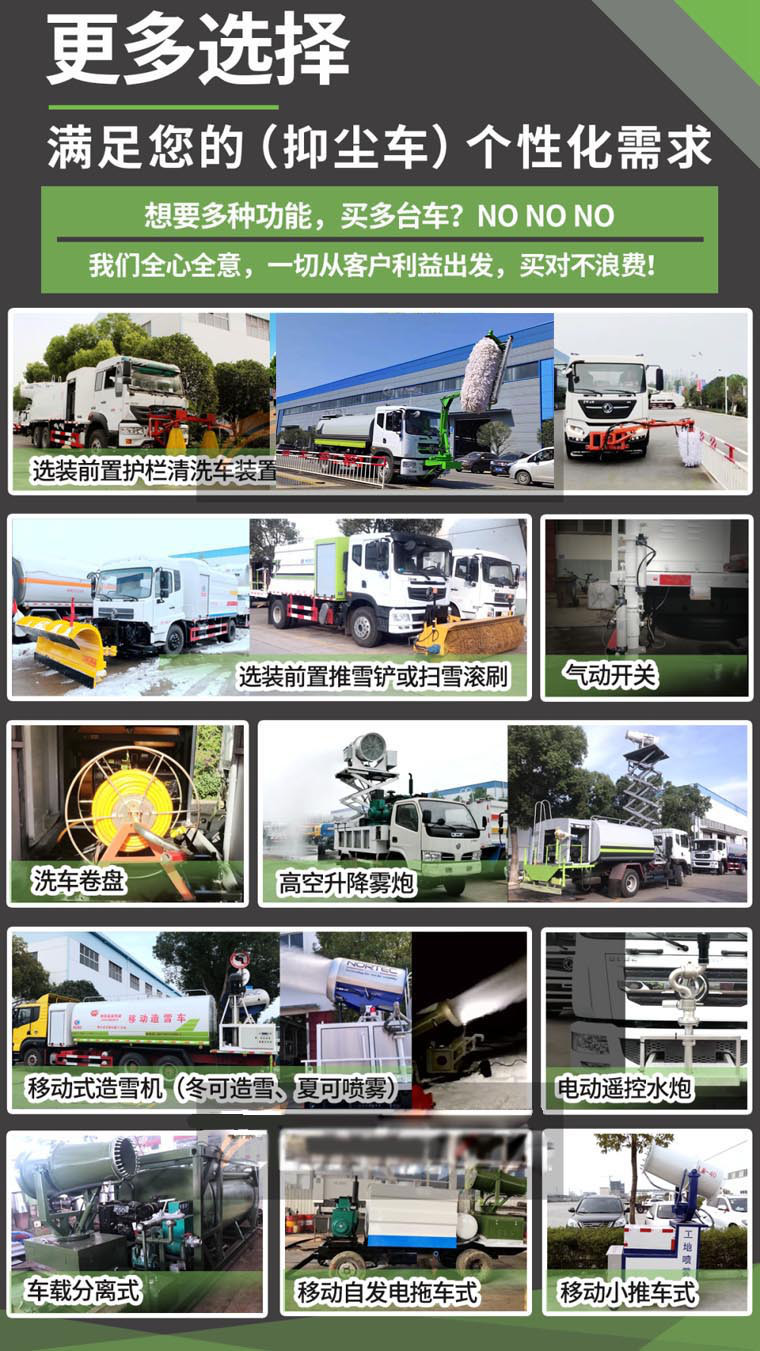 底盤參數(shù):采用國六東風D9底盤,公告型號:CLW5180TDYD6型多功能抑塵車,顏色按公告色,4500軸距,玉柴200馬力,1000R20輪胎,帶備胎,帶空調(diào),ABS,法士特六檔箱。