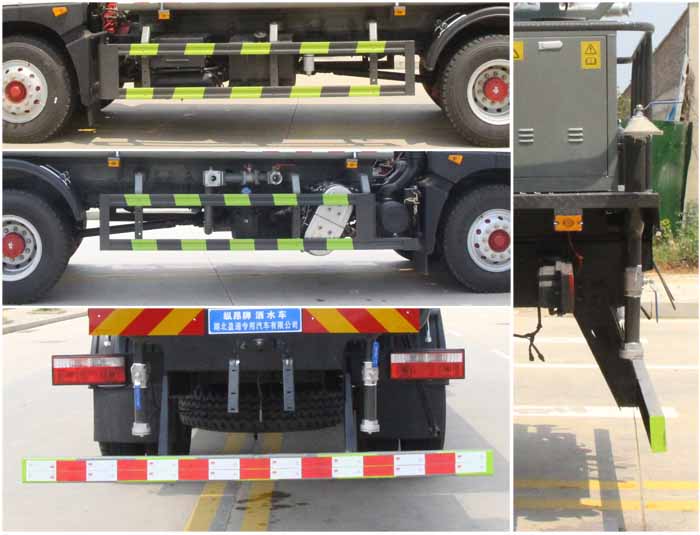 備注 | 該車主要用于城鄉園林綠化,路面噴灑,除塵和降溫;主要裝置為水罐及噴灑裝置;隨底盤選裝駕駛室,隨底盤選裝燃油箱,電瓶,尿素罐,儲氣筒左右安裝位置;罐體總容量:11.45立方米;罐體有效容積:10.9立方米;罐體外形尺寸(長×長軸×短軸)(mm):5200×2300×1400,4400×2350×1600;側、后防護材料均為:Q235碳鋼,連接方式均為:螺栓連接,后部防護截面尺寸(mm):120×50,后部防護離地高度(mm):450.ABS系統生產廠家,型號:焦作博瑞克控制技術有限公司,J ABS;襄陽東風隆誠機械有限責任公司,ABS/ASR-24V-4S/4M.選裝噴灑裝置樣式,選裝弧形噴灑裝置,選裝箭頭燈裝置,選裝自動球閥安裝位置,選裝水炮支架位置,選裝無高位花灑裝置.選裝罐體頂部方形罐口,選裝車輛前部鴨嘴裝置,選裝電子炮樣式,前伸500mm時,車輛長度為8950,8200mm.選裝后部自流口裝置,后部作業燈僅在作業時開啟,車輛行駛過程中不可開啟. | ||