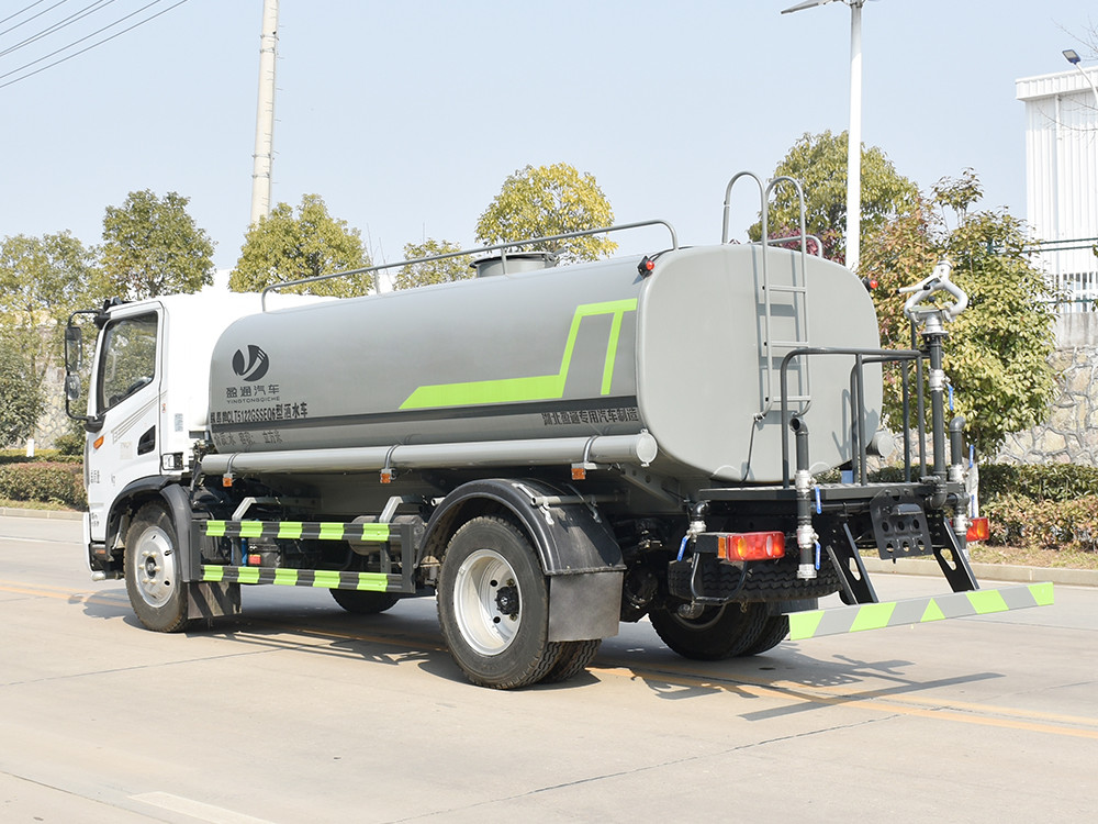 湖北盈通灑水車產品標配前噴(鴨嘴)、后沖、后灑、側噴、后置式工作 平臺,平臺上配置綠化水炮(可 360°旋轉,既可以調成柱狀,也可 以調成霧狀,更可以調成直沖狀、大雨、中雨、小雨、毛毛雨),配 備優質大功率專用灑水泵(可自吸自排,可從河里或池塘抽水到罐體), 取力器,雜物過濾網,消防接口,自流球閥系統、取力器、球閥、濾網 均為國家標準產品,主管道加粗,法蘭墊、法蘭盤加厚,大通徑球閥。 整體具備性能優良安全可靠、效率高、流量大、維修方便等特點。