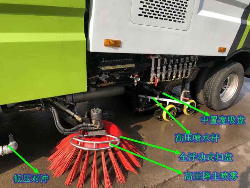 4)、采用“中置兩立掃+中置寬吸嘴(內置高壓水噴桿)+左右高壓側噴桿”的結構。
