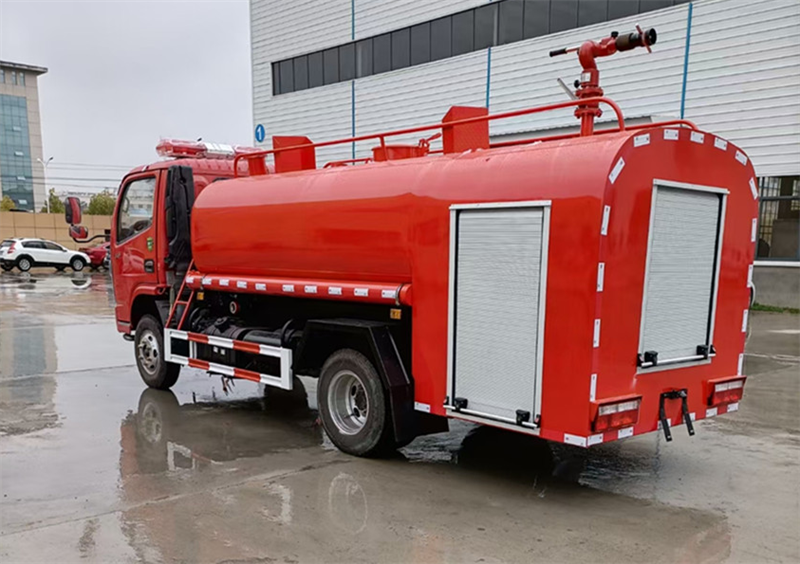東風多利卡消防灑水車:罐體容積 6.8 立方,達到國五排放標準,配備消防泵和消防炮,射程可達 50 米以上