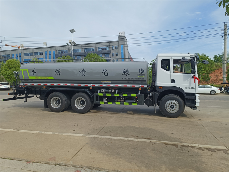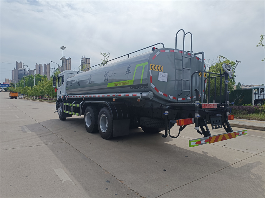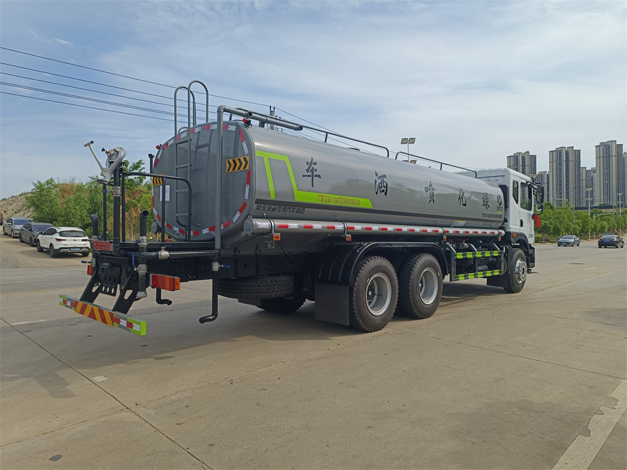 東風20噸灑水車產品標配前噴(鴨嘴)、后沖、后灑、側噴、后置式工作 平臺,平臺上配置綠化水炮(可 360°旋轉,既可以調成柱狀,也可 以調成霧狀,更可以調成直沖狀、大雨、中雨、小雨、毛毛雨),配 備優質大功率專用灑水泵(可自吸自排,可從河里或池塘抽水到罐體), 取力器,雜物過濾網,消防接口,自流球閥系統、取力器、球閥、濾網 均為國家標準產品,主管道加粗,法蘭墊、法蘭盤加厚,大通徑球閥。 整體具備性能優良安全可靠、效率高、流量大、維修方便等特點