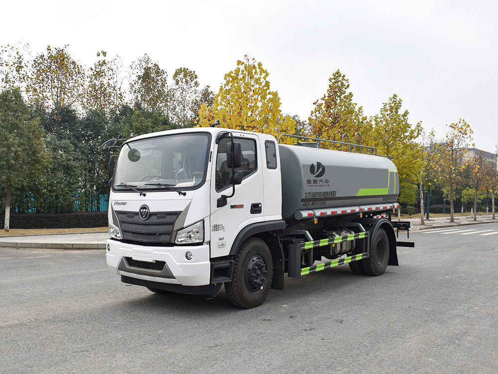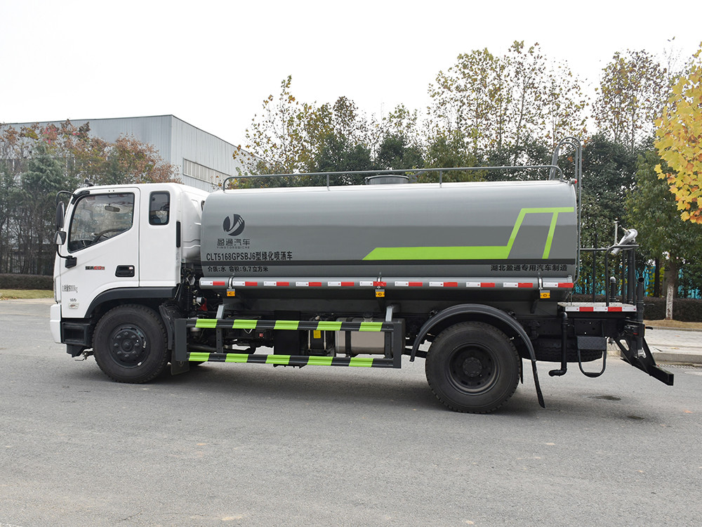 湖北盈通灑水車產品標配前噴(鴨嘴)、后沖、后灑、側噴、后置式工作 平臺,平臺上配置綠化水炮(可 360°旋轉,既可以調成柱狀,也可 以調成霧狀,更可以調成直沖狀、大雨、中雨、小雨、毛毛雨),配 備優質大功率專用灑水泵(可自吸自排,可從河里或池塘抽水到罐體), 取力器,雜物過濾網,消防接口,自流球閥系統、取力器、球閥、濾網 均為國家標準產品,主管道加粗,法蘭墊、法蘭盤加厚,大通徑球閥。 整體具備性能優良安全可靠、效率高、流量大、維修方便等特點。