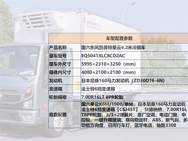 東風星云4米2冷藏車基本參數:整車外形尺寸:5995×2250×3110mm,車廂凈空尺寸為:4090×2100×2100mm,車廂容積約為18立方,總質量為:4495Kg,整備質量為:3200Kg,額定質量為:1100Kg.車輛符合上藍牌的標準,可進市區,C證可開,無需辦理從業資格證和營運證。國六東風輕型柴油發動機,3.0L排量,160馬力發動機,6檔變速箱,整車型號為:EQ5041XLC8CD2AC.