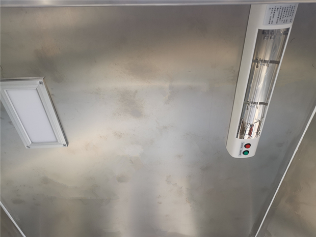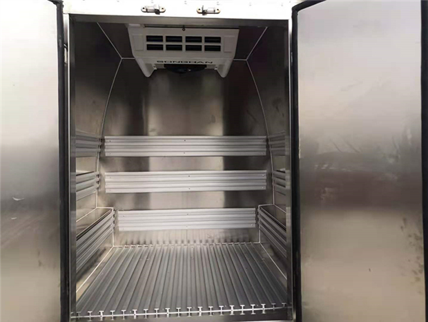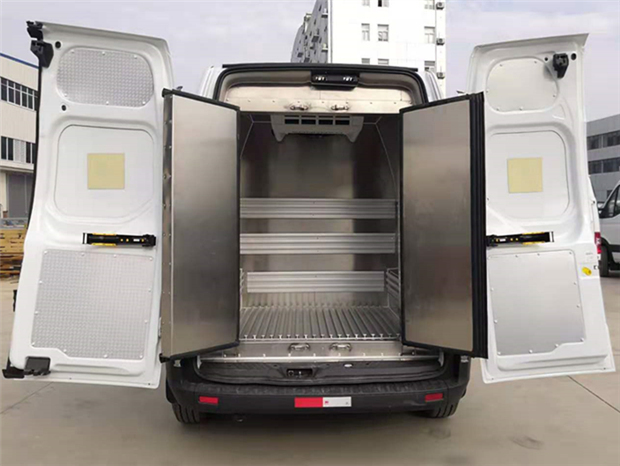 福特全順汽油版疫苗冷鏈車車廂配置: 保溫廂內板為304不銹鋼板,夾保溫層制作,廂體底板和四周廂板安裝通風槽。廂內帶LED照明燈,溫濕度顯示記錄儀,紫外線消毒燈,外場照明燈燈配置。不銹鋼門框,鎖件。