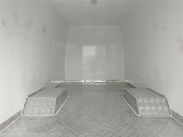 依維柯長軸冷藏車車廂配置:廂體采用內外優質玻璃鋼板,內膽圓弧式廂體,地板為鋁花紋板,底板和四周廂板加裝通風槽,不銹鋼門框,鎖件。