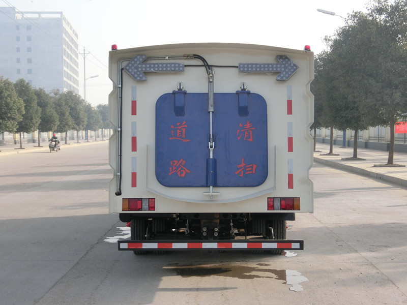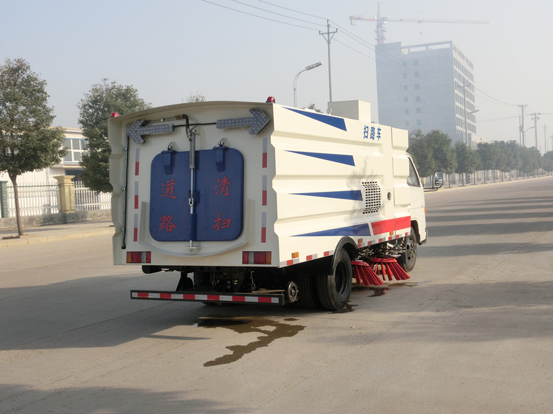 該掃路車采江鈴國五二類底盤改裝,加裝副發(fā)動(dòng)機(jī)、風(fēng)機(jī)、清水箱、垃圾箱、左右立掃、后置吸盤,掃盤降塵系統(tǒng),液壓系統(tǒng)、專用裝置電控系統(tǒng)和副車架等改裝而成(可加裝前沖后灑)