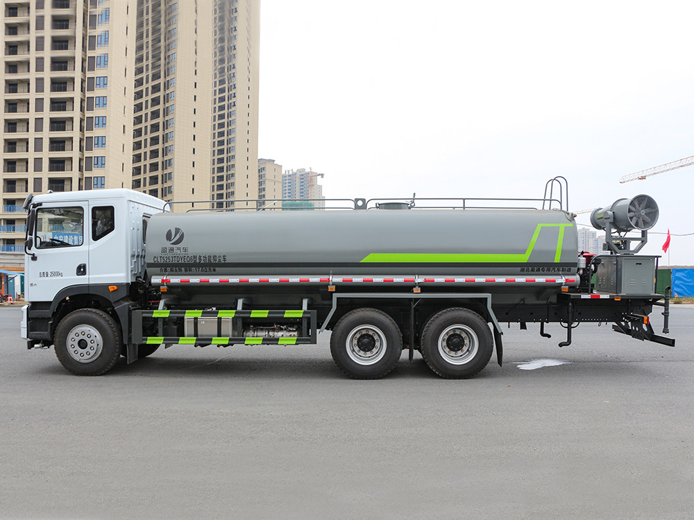 東風(fēng)華神T5 -20方抑塵車-大型霧炮車產(chǎn)品主要技術(shù)參數(shù) 序號(hào) 名稱 型號(hào)、規(guī)格 1 整車型號(hào) CLT5253TDYEQ6 型多功能抑塵車 2 發(fā)動(dòng)機(jī)型號(hào) B6.2NS6B260 3 發(fā)動(dòng)機(jī)馬力/功率 康明斯 260 馬力/191KW 4 發(fā)動(dòng)機(jī)排量 6200ML 5 變速箱 法士特 8 檔(帶高低檔) 6 輪胎規(guī)格 11.00 鋼絲胎 7 軸距 4350+1350 8 總質(zhì)量 25000KG 9 整備質(zhì)量 11400KG 10 額定載質(zhì)量 13405KG 11 整車尺寸(長×寬×高) 10.45*2.51*3.2 12 罐體容積 20 方 13 燃料種類 柴油 14 排放標(biāo)準(zhǔn) 國六 15 水泵型號(hào) 60/90 16 罐體材質(zhì) Q235 碳鋼