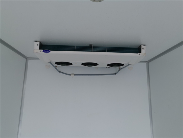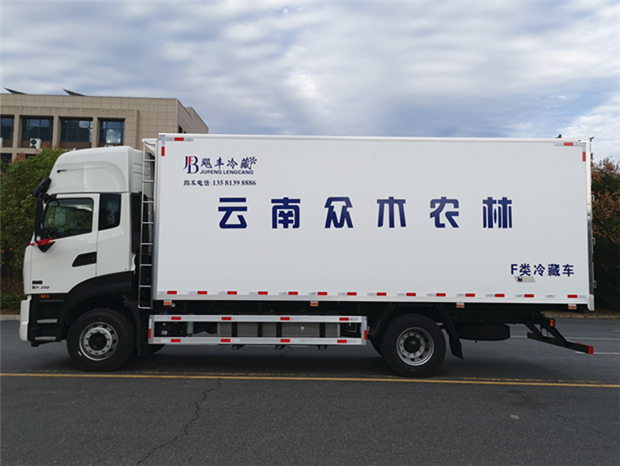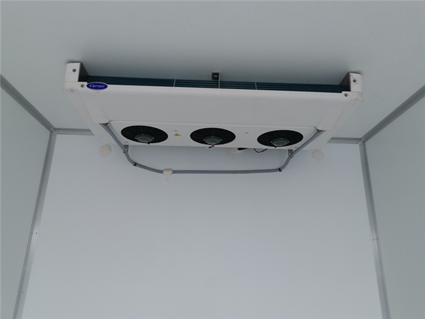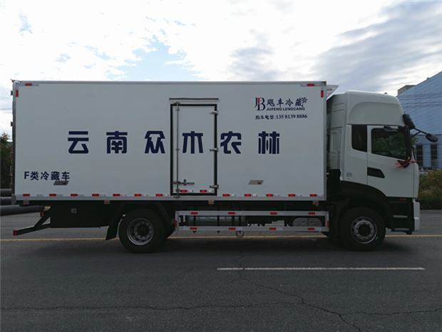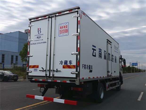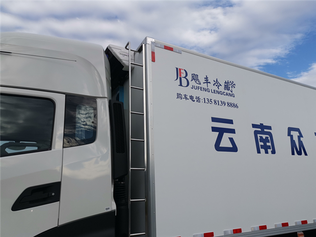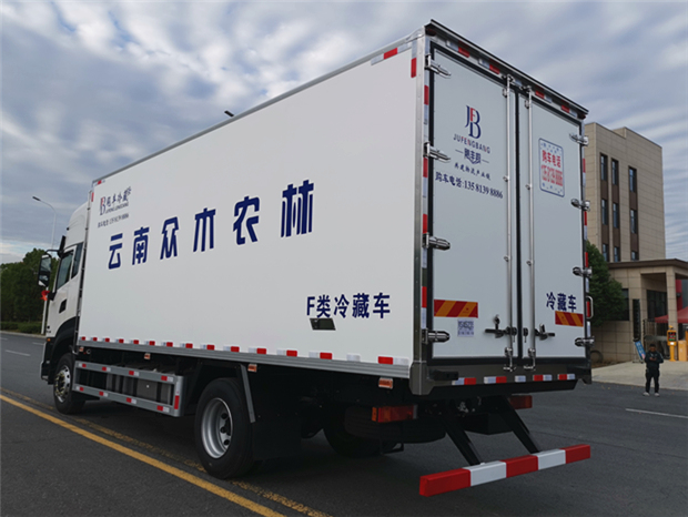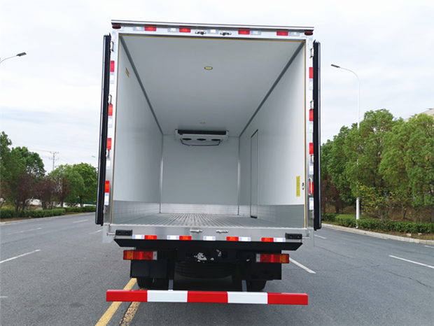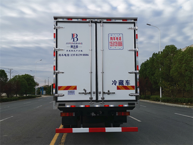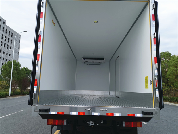 車廂配置為:《斷橋隔溫工藝、整體結構框架》;內外面料為3mm新款玻璃鋼;側板+頂板:全密封雙組合聚氨酯膠粘連;廂體厚度為8cm;頂板10cm厚,底板12cm厚,最新款鋁合金包邊型材;型材局部厚度為4mm(鋼制鉚釘加固);廂體內部采用2個LED照明燈及廂體示寬燈;后門框為3mm厚不銹鋼材質;門框密封條為三元乙丙橡膠材質;加厚型不銹鋼合頁及鎖件;副梁為Q700車用大梁鋼;15mm厚大梁墊皮;加裝防撞膠塊;不銹鋼門鎖件,配后雙開門。底板為加厚鋁合金通風槽滿焊,帶30cm高新型圍裙,副駕駛一側居中靠前開單側門,鋁合金側防護,不銹鋼冷機維護爬梯,帶大工具箱一個。帶剎車淋水器,前后淋水分別控制。