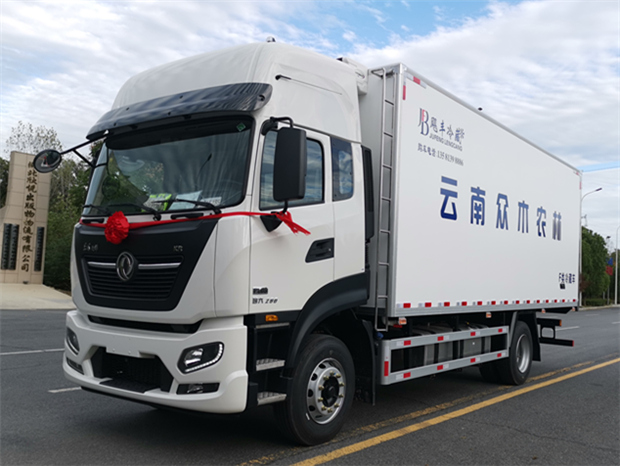 東風天錦6米8冷藏車-國六290馬力,整車型號為:DFH5180XLCEX7,發動機型號為:D6.7NS6B290,整車外形尺寸:9200×2600×3960mm,箱體尺寸6800×2440×2450mm,總質量:18000Kg,整備質量:7880Kg,額定質量為:9990Kg.