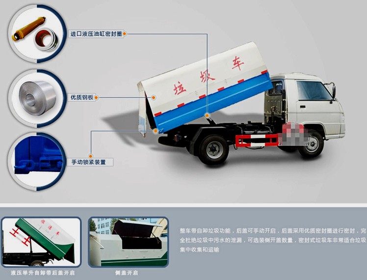 密封式垃圾車又稱自卸式垃圾車,主要由汽車底盤、箱體、開門機構(gòu)、舉升機構(gòu)、電液控制系統(tǒng)等組成,是一種新型機、電、液一體化的全密封結(jié)構(gòu)垃圾運輸車輛,它不但可與LSY系列垃圾站配套使用,也可廣泛用于城鎮(zhèn)居民生活區(qū)、工業(yè)區(qū)、商業(yè)區(qū)、學(xué)校、公園、風(fēng)景區(qū)等場所的垃圾運輸工作
